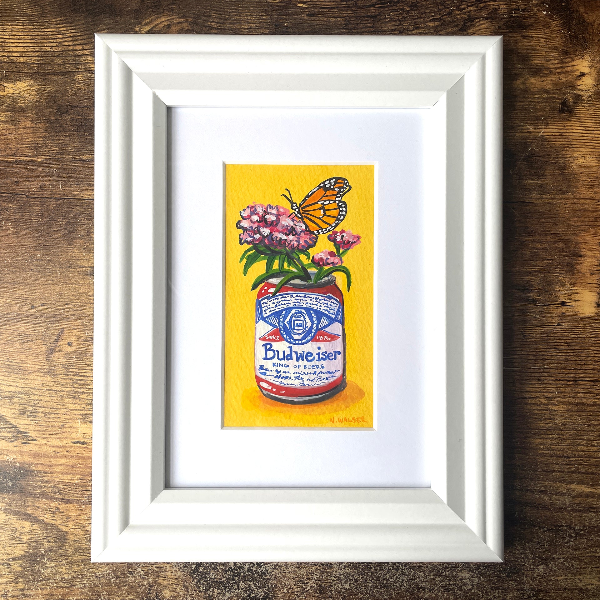 Budweiser beer, hosting a monarch who is interested in the milkweed resting in the can. Milkweed is one of the flowers that attract Monarchs, here in the midwest.