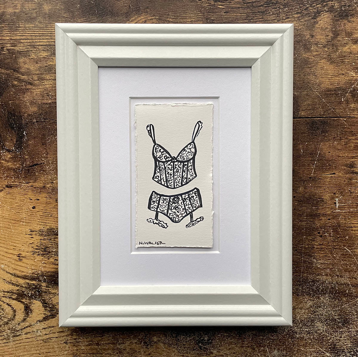A full lingerie set complete with thigh high stocking ruffles. This small painting is framed to show off the beautiful deckled edge of the watercolor paper. Black gouache on white paper.