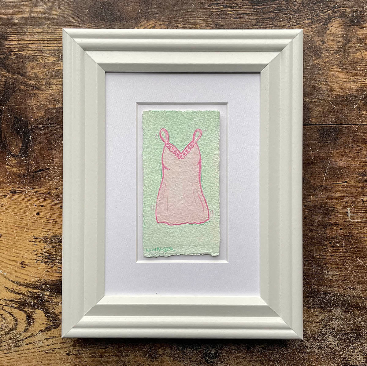 A dainty pink slip on a mint green background, a perfect and cute color combo. This small painting is framed to show off the beautiful deckled edge of the watercolor paper.