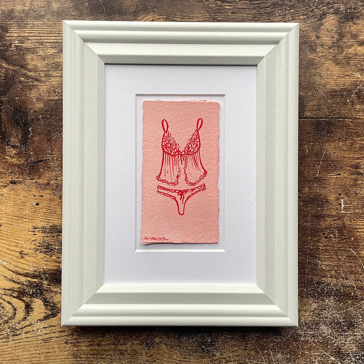 A red lace up camisole set, on a light pink background. This small painting is framed to show off the beautiful deckled edge of the watercolor paper.